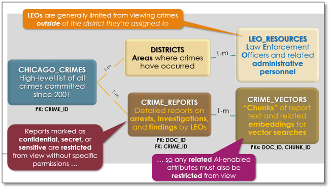 The basic ERD in Figure 1 shows how crime data is organized within the CPD schema, and the callouts give you some idea of the complexity of the data security policies you’ll need to implement to ensure each user only sees the data they’re permitted to see.
