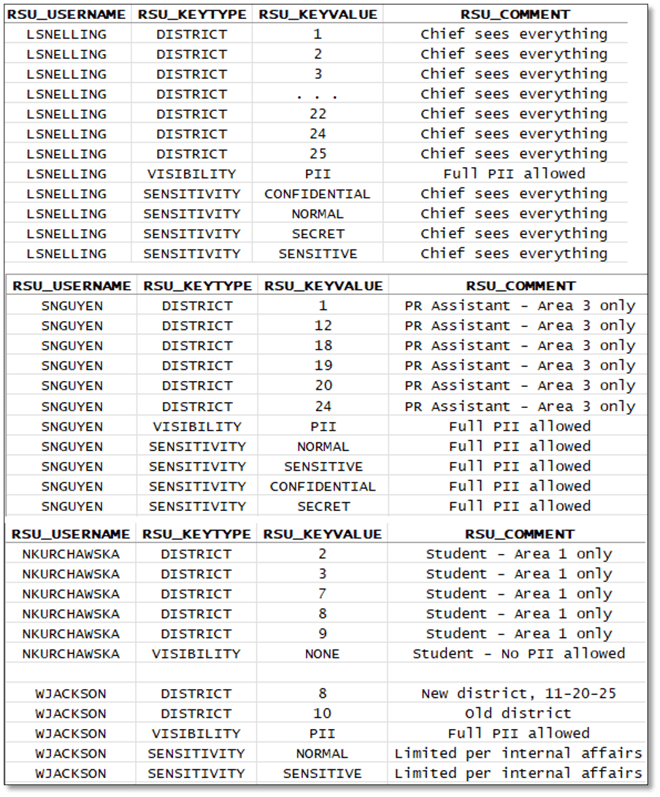 - LSNELLING is the current Chief of Police, so they have access to all CPD Districts, have permission to view data in restricted columns, and permission to view rows at all four security levels.