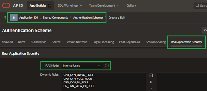 Under the Real Application Security section, I’ll set RAS Mode to Internal Users. This effectively tells APEX to connect to the corresponding RAS user account I set up back in Step 3.
