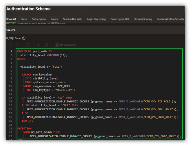Remember those dynamic roles I built, way back in Step 2? Here’s where they finally come into play. Now there is a special post-authentication script that assigns an appropriate RAS dynamic role to my application user’s session. To enable the proper role, the procedure queries the RAS_SECURED_USERS table to obtain their visibility level and sets the dynamic role accordingly (Figure 18) via a call to procedure APEX_AUTHORIZATION.ENABLE_DYNAMIC_GROUPS.